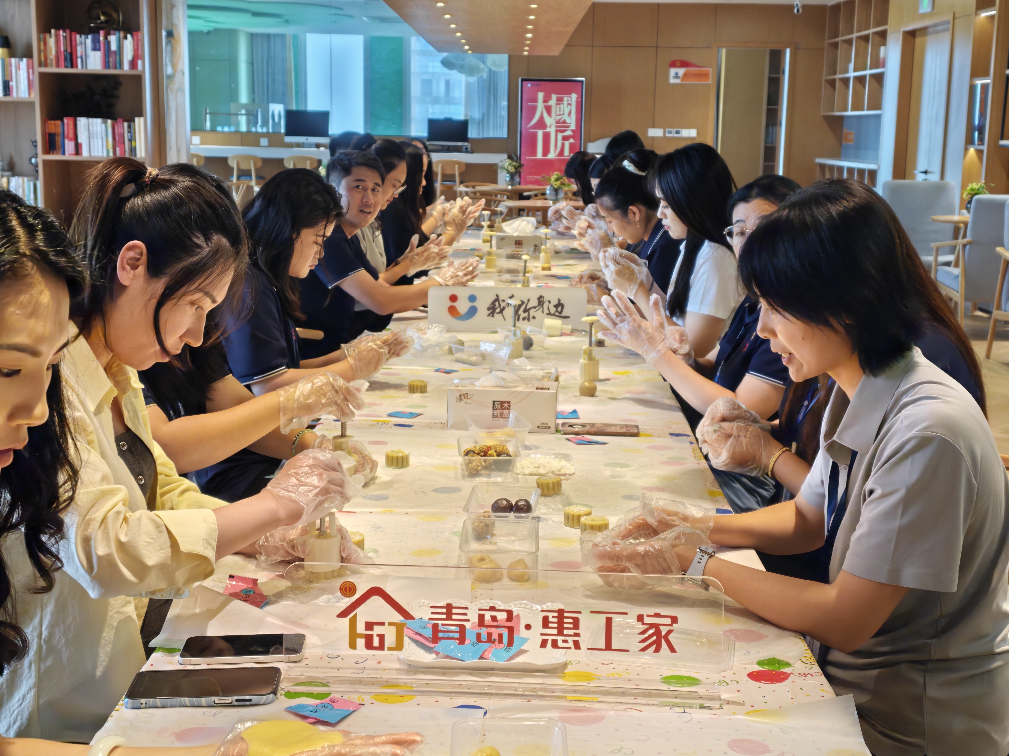 在专业老师指导下,大家兴致盎然地投入手工月饼制作中,从和面、擀皮到包馅、压?!扛霾街瓒汲渎诵缕婧吞粽?。大家相互协作、交流技巧,当印有精美图案、饱含心意的月饼制成时,满满的成就感与节日的甜蜜感弥漫现场。大家在制作传统美食中,用双手揉进对团圆最美好的期许,饱含着最真挚的情谊。